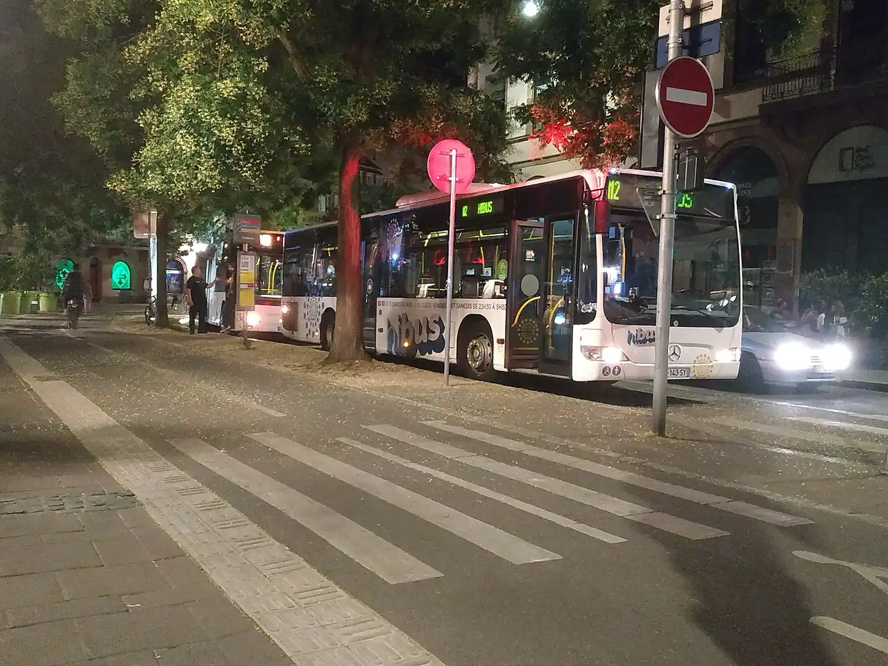 Además, el servicio nocturno Hibus opera todos los jueves, viernes y sábados (incluidos festivos). Tres líneas operan de 23:30 a 05:30, con salidas cada hora desde la Place Corbeau. Se puede viajar con un billete o pase CTS estándar. Hibus para en las calles y zonas más concurridas de la ciudad.